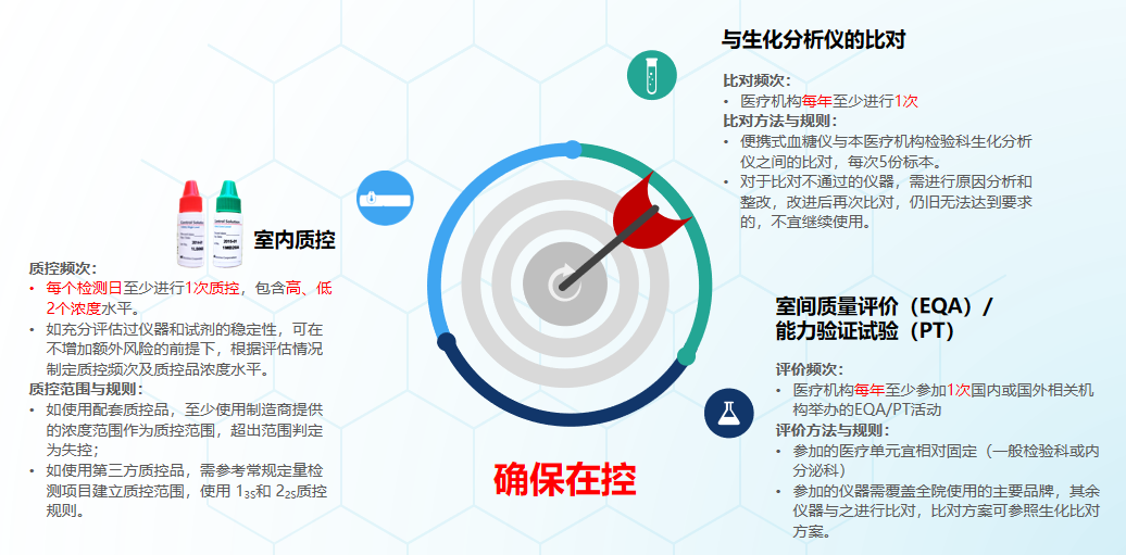 (三)明確質(zhì)控要求,從室內(nèi)質(zhì)控,與生化分析儀的比對,室間質(zhì)量評價(EQA)/能力驗證試驗等方面做出了詳細(xì)規(guī)定;如在室內(nèi)質(zhì)控頻次上,要求每個檢測日至少進(jìn)行1次質(zhì)控,包含高、低2個濃度水平,這些細(xì)則的出臺能夠幫助院內(nèi)POCT最大化“確保在控”。