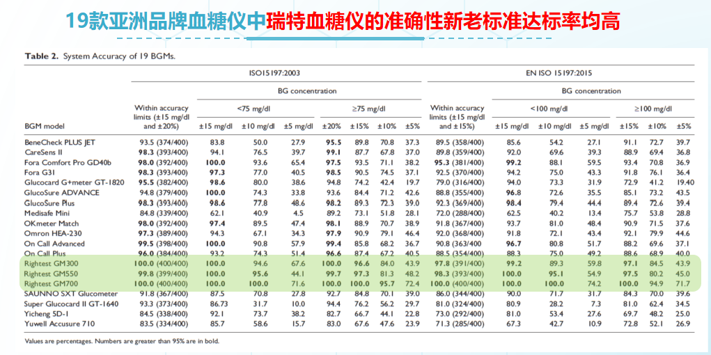 作為案例,張主任還列舉了一項由專業(yè)實驗室團(tuán)隊進(jìn)行的亞太地區(qū)血糖儀準(zhǔn)確度測試實驗。實驗結(jié)果顯示,在接受測試的19款亞洲品牌血糖儀中,瑞特血糖儀的準(zhǔn)確性的達(dá)標(biāo)率均處于較高水平。
