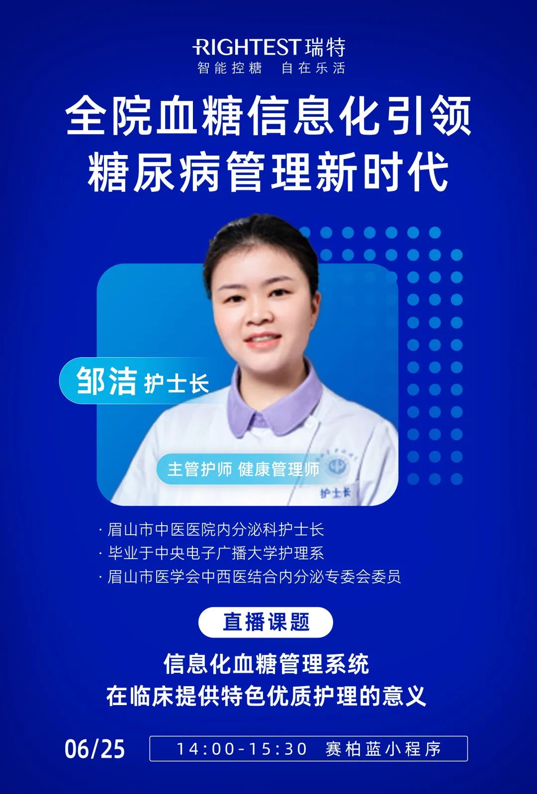 帶著醫(yī)護(hù)人員共同關(guān)心的問題,知名血糖管理品牌華廣瑞特?cái)y手眉山市中醫(yī)醫(yī)院內(nèi)分泌科護(hù)士長鄒潔在“賽柏藍(lán)”小程序召開了一場主題為“全院血糖信息化引領(lǐng)糖尿病管理新時(shí)代”的學(xué)術(shù)直播會(huì)議。一直致力于內(nèi)分泌代謝疾病的臨床護(hù)理與管理工作的鄒護(hù)士長從實(shí)踐經(jīng)驗(yàn)出發(fā),圍繞信息化血糖監(jiān)測管理系統(tǒng)如何提供優(yōu)質(zhì)護(hù)理的臨床應(yīng)用議題,為大家進(jìn)行專題分享。