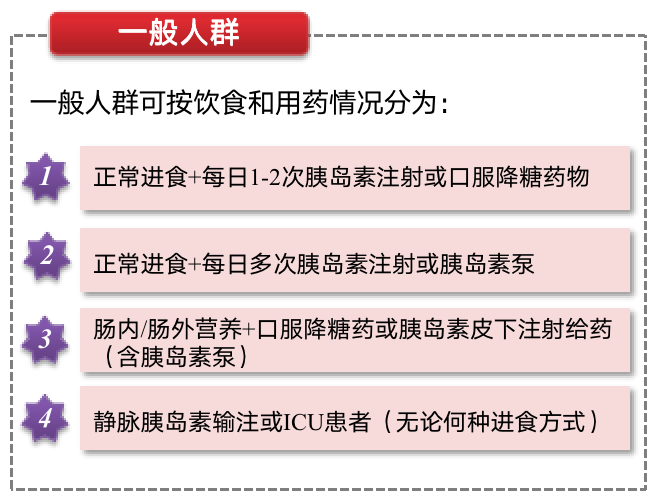 ◇ 正常進(jìn)食+每日1-2次胰島素注射或口服降糖藥物:四點(diǎn)法(三餐前、睡前)