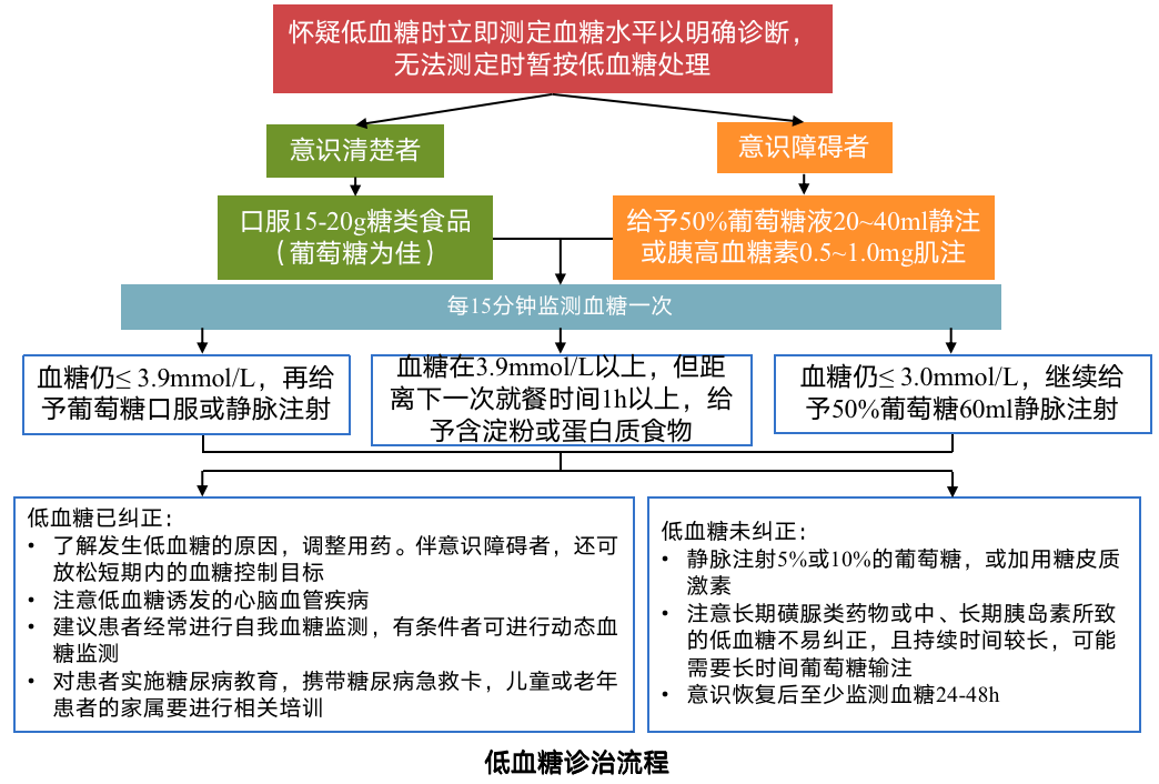 懷疑低血糖時(shí)立即測定血糖水平以明確診斷,無法測定時(shí)暫按低血糖處理。如圖所示,對(duì)于意識(shí)清楚者和意識(shí)障礙者,應(yīng)分別采取不同的診療措施。