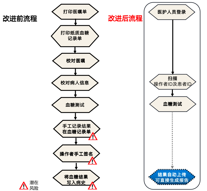 引入信息化血糖管理系統(tǒng)后,可實(shí)現(xiàn)科室內(nèi)流程監(jiān)測流程的最優(yōu)化,四步即可完成血糖監(jiān)測并規(guī)避監(jiān)測風(fēng)險(xiǎn),如數(shù)據(jù)自動(dòng)傳輸避免手工謄寫差錯(cuò)。相比于傳統(tǒng)血糖管理模式,信息化血糖管理模式的患者信息識(shí)別、血糖數(shù)值和血糖數(shù)據(jù)反饋給醫(yī)師的準(zhǔn)確率顯著增加。通過強(qiáng)化院內(nèi)信息化血糖監(jiān)測,可有效降低多時(shí)點(diǎn)的低血糖發(fā)生率,對(duì)醫(yī)護(hù)和患者帶來諸多益處。