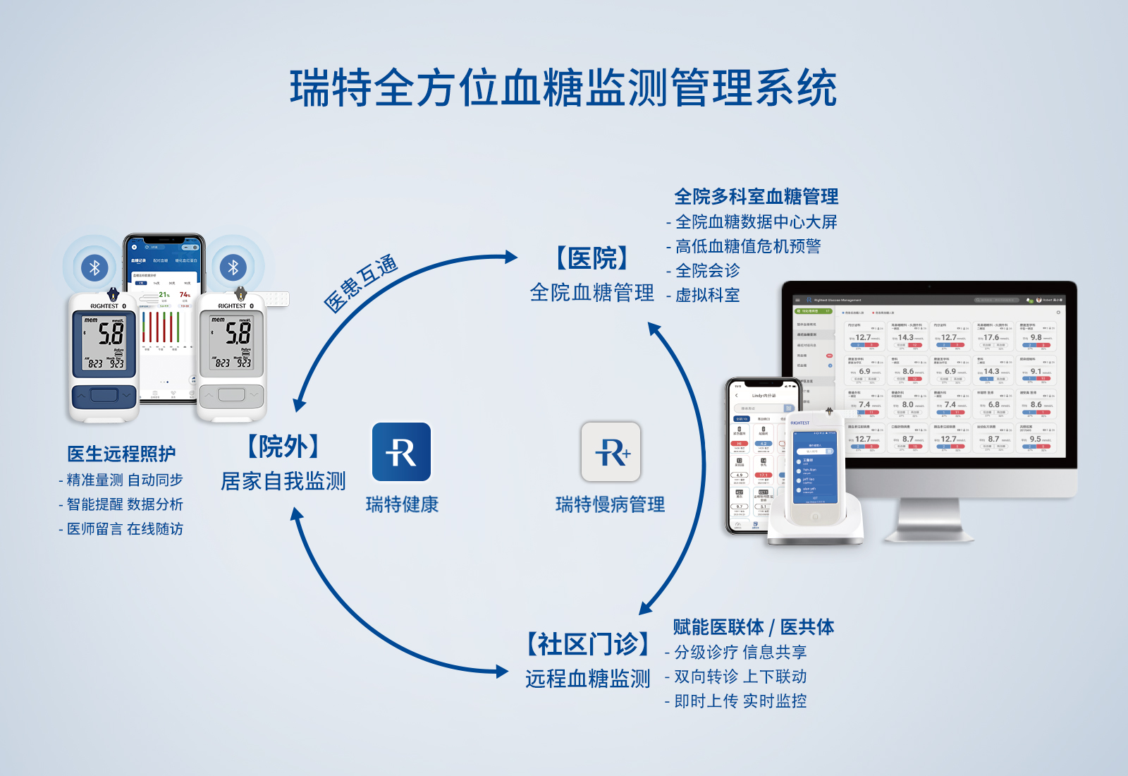 華廣瑞特積極思考應(yīng)對(duì)臨床血糖監(jiān)測(cè)管理的現(xiàn)狀問(wèn)題,在“全院血糖管理中心”臨床實(shí)踐中,以全方位智能血糖管理系統(tǒng)為糖尿病防控的抓手,實(shí)現(xiàn)以患者為中心,從面向醫(yī)務(wù)人員的“智慧醫(yī)療”、面向患者的“智慧服務(wù)”、面向醫(yī)院的“智慧管理”3個(gè)維度,深度融合門診、住院、出院、居家全場(chǎng)景全流程血糖管理,完成診前、診中、診后場(chǎng)景全覆蓋。通過(guò)全院血糖管理一體化的頂層設(shè)計(jì),打通科室壁壘,建立以內(nèi)分泌科為主導(dǎo)的多學(xué)科協(xié)作模式,為全院血糖異常患者制定個(gè)體化方案、血糖控制目標(biāo)及隨訪計(jì)劃,使每位住院患者的血糖水平得到控制,以減少住院患者因糖代謝紊亂所致的相關(guān)疾病死亡率、感染等,縮短術(shù)前等待時(shí)間、住院時(shí)間,節(jié)省有限的醫(yī)療資源,使廣大患者獲益。