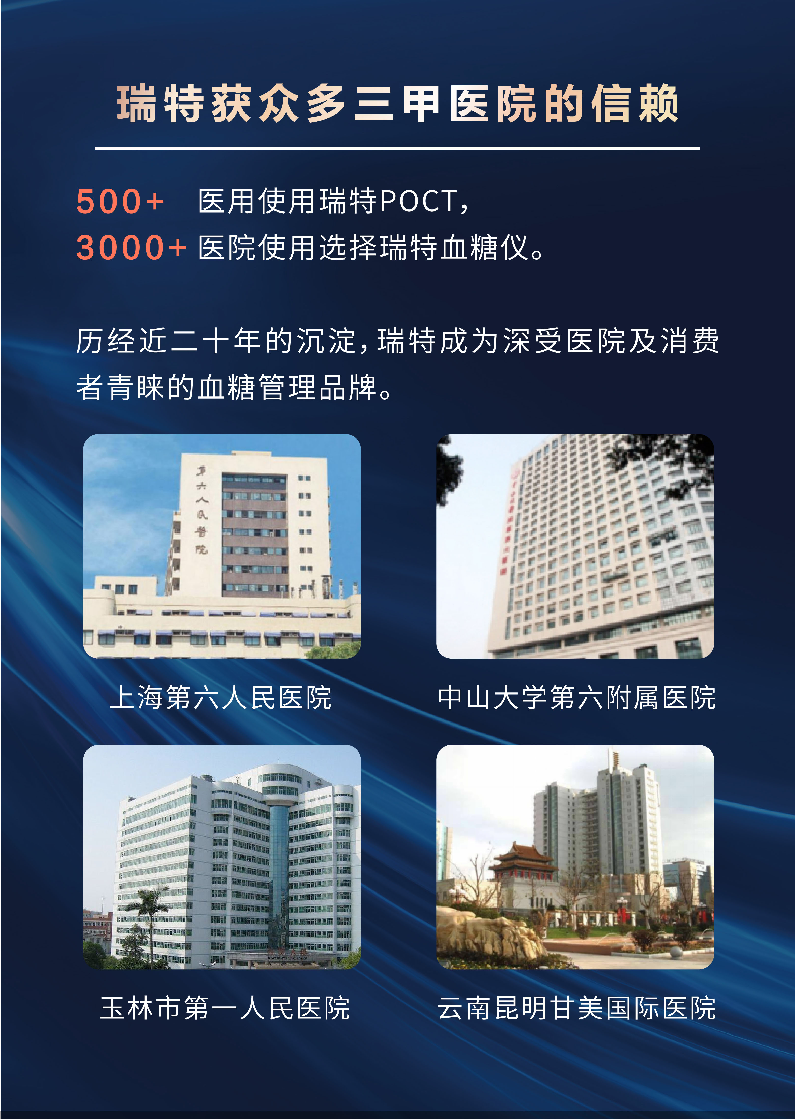 瑞特血糖儀取得中國、美國、歐盟等主要5大系統(tǒng)認(rèn)證,并在全球超過80個(gè)國家和地區(qū)認(rèn)證。正是基于卓爾不群的品質(zhì),全國目前已有超過500家醫(yī)院使用了瑞特“全方位智能血糖監(jiān)測系統(tǒng)”,有超過3000家醫(yī)院使用了瑞特血糖儀。