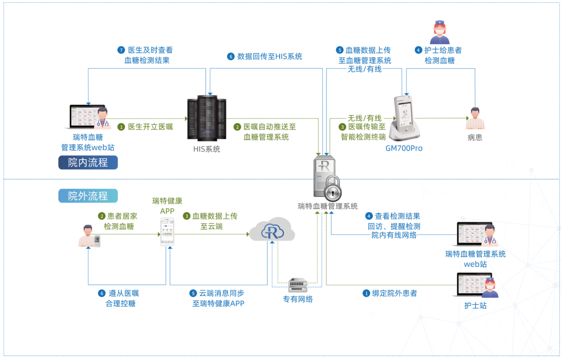 另一方面,瑞特“全方位智能血糖監(jiān)測管理系統(tǒng)”通過物聯(lián)網(wǎng)+模式,將醫(yī)院使用瑞特血糖儀GM700Pro、瑞特慢病管理系統(tǒng)及瑞特自我管理血糖儀與醫(yī)院HIS系統(tǒng)打通,實現(xiàn)了糖尿病人自我監(jiān)控到院內(nèi)門診、住院護理的無縫銜接和全智能化管理,構(gòu)建出一整套智能化血糖生態(tài)管理體系,讓醫(yī)生管理病患得心應(yīng)手,讓病人出院后照護持續(xù)不漏。通過瑞特管理系統(tǒng)的應(yīng)用,醫(yī)生更有治療成就感,患者更有就醫(yī)獲得感,真正達到了“智慧醫(yī)療”的目的。