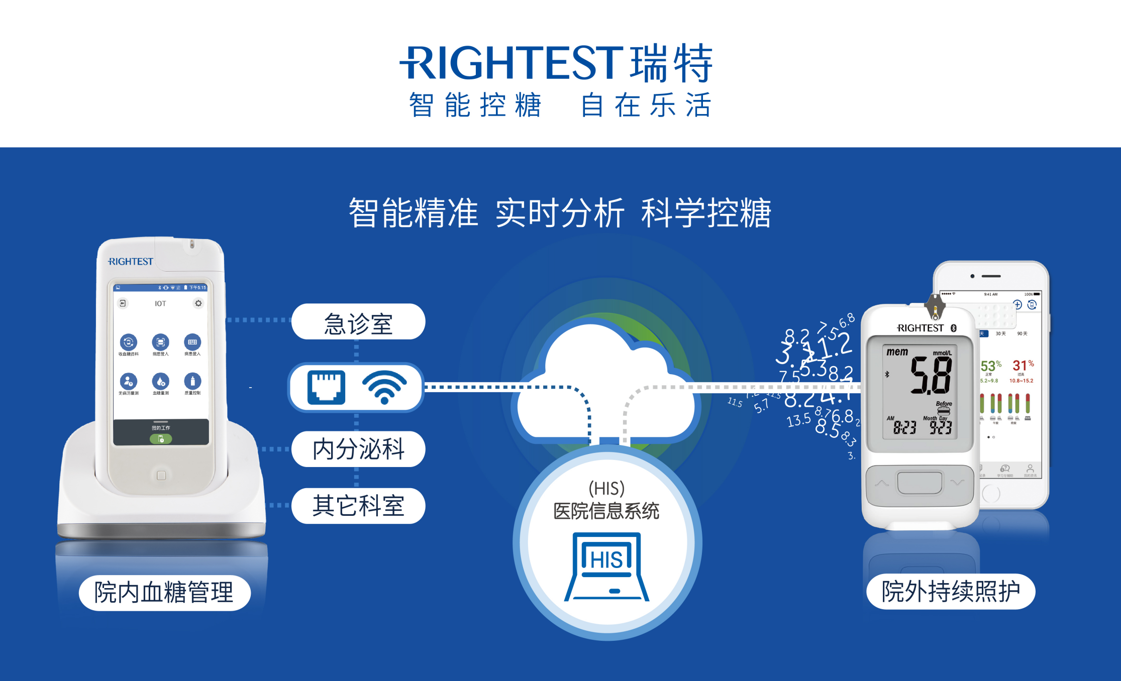 瑞特專為糖尿病患與專業(yè)醫(yī)療機(jī)構(gòu)量身打造了"全方位智能血糖管理系統(tǒng)",支持與醫(yī)院HIS等院內(nèi)信息系統(tǒng)單向或雙向信息傳輸。