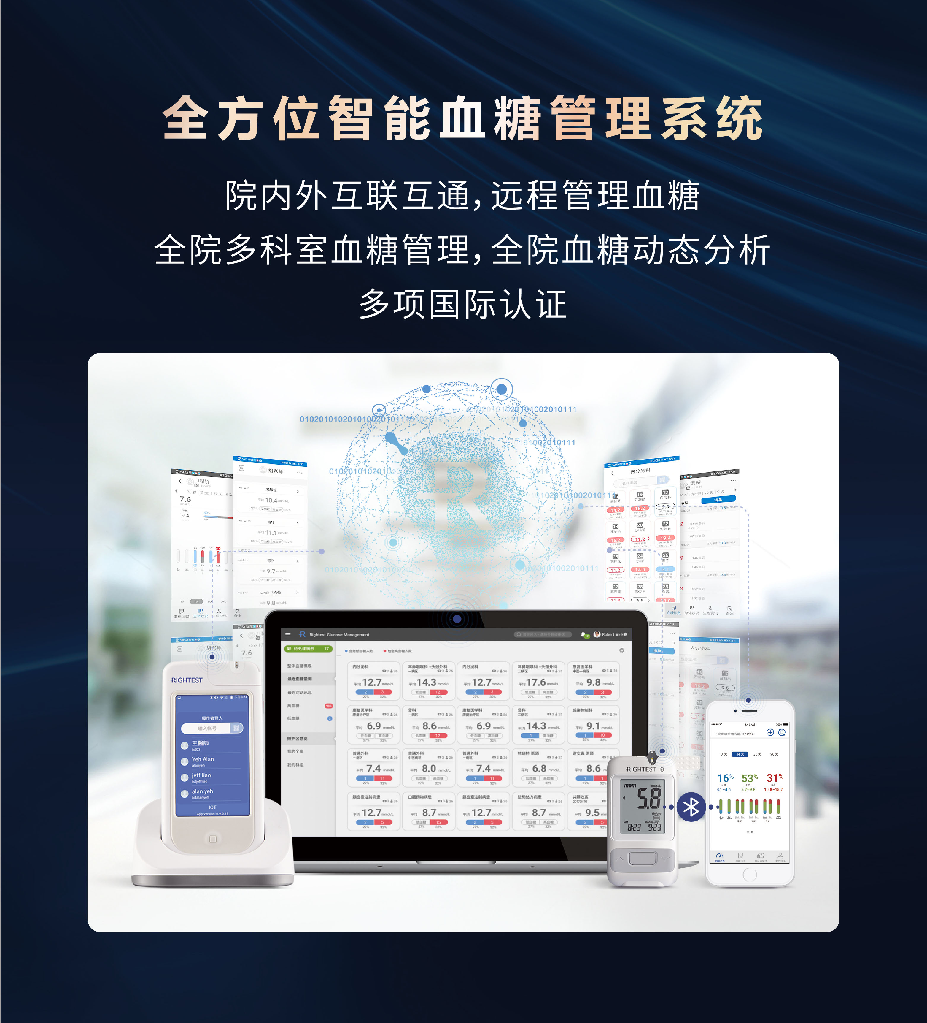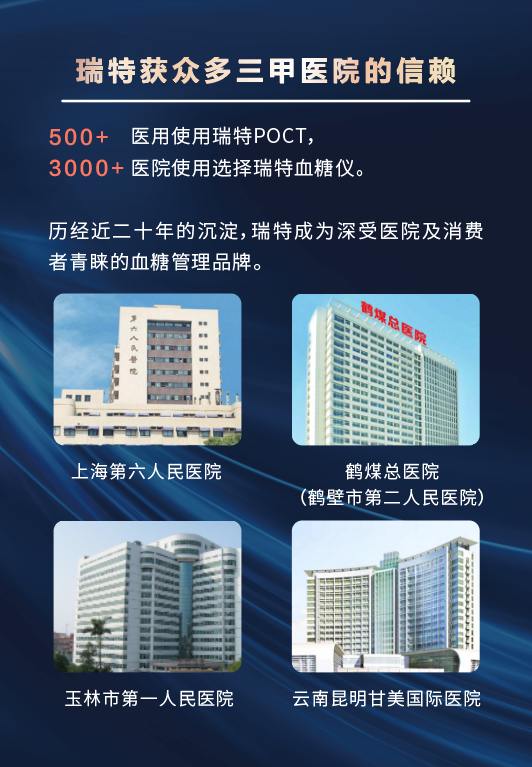 瑞特成功整合了先進的醫(yī)療、化學(xué)、電子與精密制造技術(shù),獲得多項獨特的血糖檢測專利,采用黃金電極專利技術(shù),確保每一次血糖測量數(shù)據(jù)的準(zhǔn)確性。迄今為止,瑞特產(chǎn)品在全球已經(jīng)取得超過80個國家的權(quán)威認證,產(chǎn)品銷售遍布全球100多個國家和地區(qū),瑞特血糖管理系統(tǒng)成功入駐500多家醫(yī)院,瑞特血糖儀產(chǎn)品供貨國內(nèi)3000多家醫(yī)院。